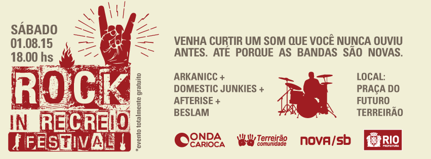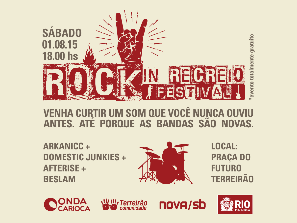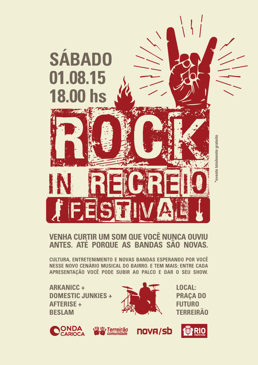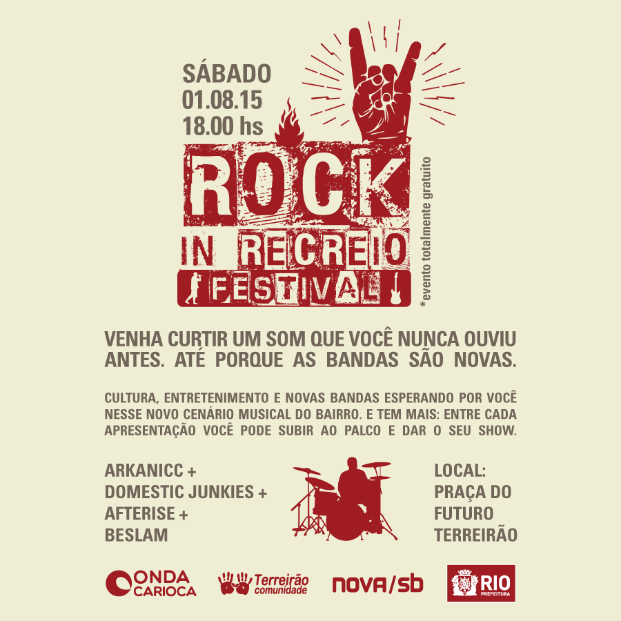 A nova/sb fez a arte para as peças de divulgação do Rock in Recreio, um evento que faz parte do eixo cultural do projeto Praça do Futuro Terreirão da ONG Onda Carioca. A entidade transformou a praça Eurico Alencastro Massot, que estava degradada e fica próxima a uma comunidade carente, em um pólo de cultura, educação e lazer.